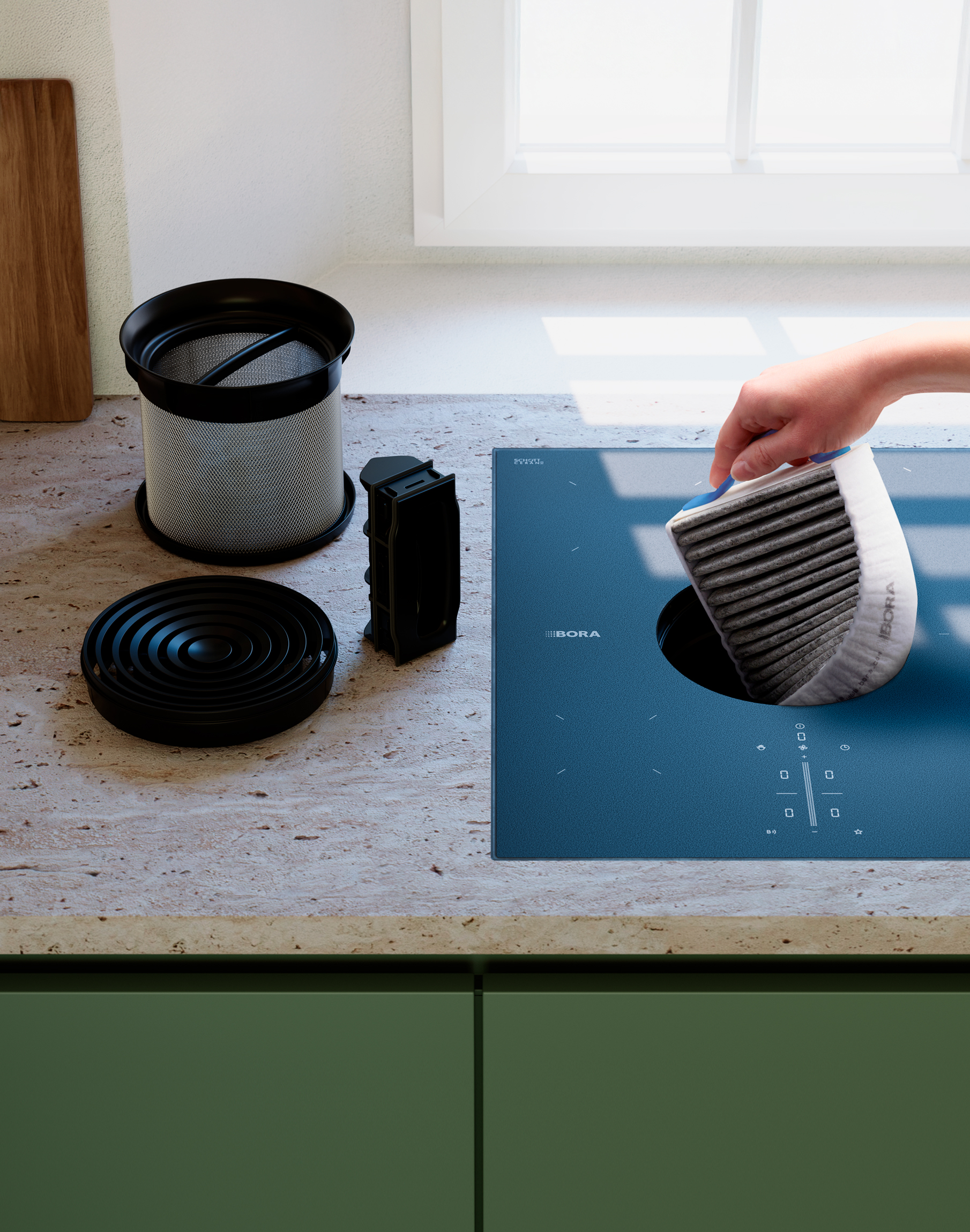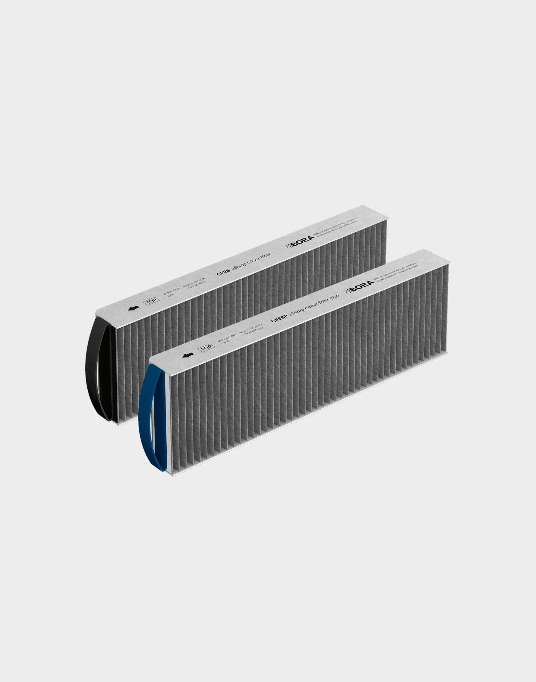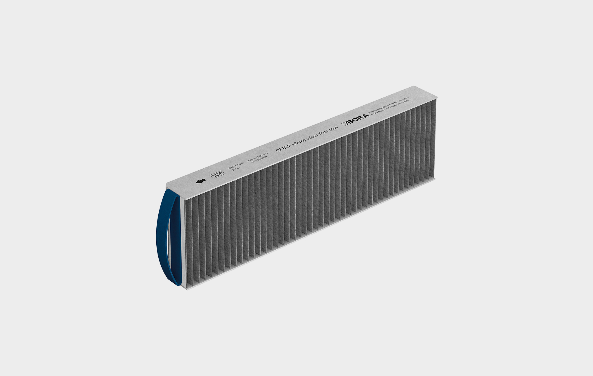 Los nuevos filtros de olores BORA se integran de forma discreta en el sistema, actuando de manera silenciosa pero constante. Gracias al uso de carbón activo de alta calidad, las moléculas responsables de los olores se retienen eficazmente, manteniendo una sensación de limpieza continua en el espacio de cocina.