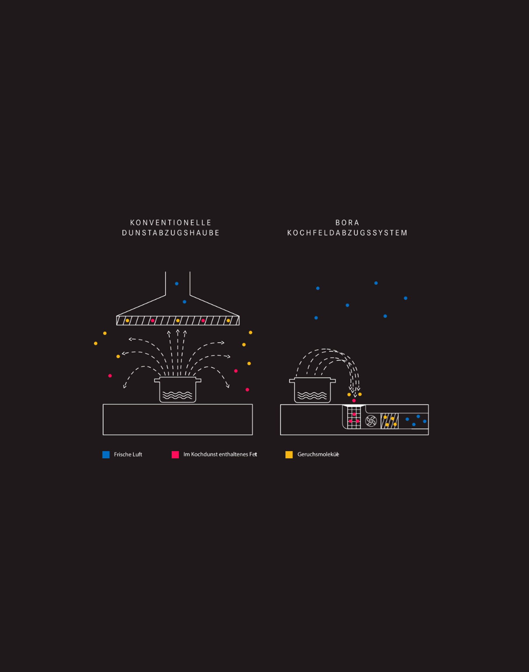 Inicialmente, BORA se destacó por sus sistemas de extracción de superficie que aspiran los vapores de cocción hacia abajo utilizando tecnología avanzada. Luego ampliaron su cartera con el BORA X BO, un horno de vapor profesional para el hogar, el multicajón BORA y sistemas de refrigeración, congelación e iluminación. Estos productos son conocidos por su alto rendimiento y fácil limpieza.