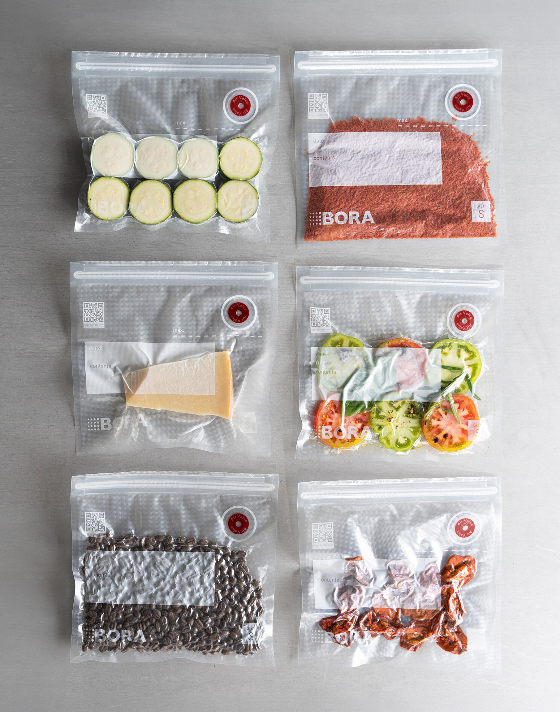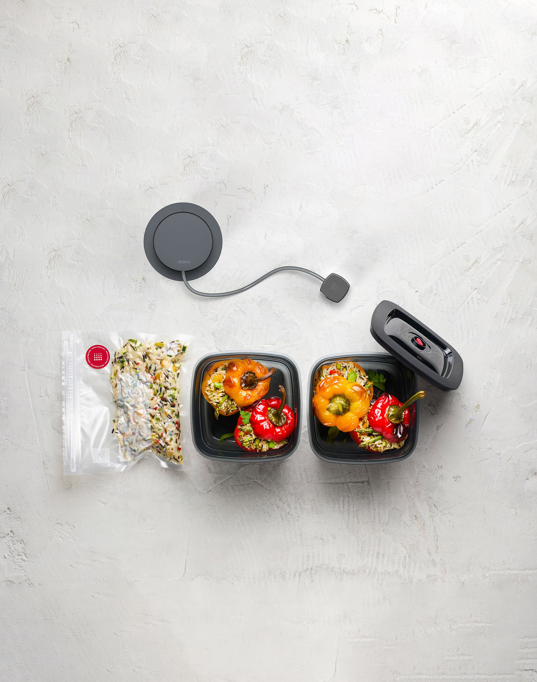 El dispositivo viene acompañado de recipientes y accesorios diseñados para la conservación a largo plazo. Incluye cajas de vacío en cristal ahumado oscuro, sin BPA, aptas para congelador y lavavajillas, así como un juego de 15 bolsas reutilizables en tres tamaños diferentes. La tienda online de BORA complementa la experiencia con anillos de marinado, sellos de vacío para botellas y bolsas adicionales, además de la colección de libros Food, con recetas exclusivas de marinado y cocción al vacío.