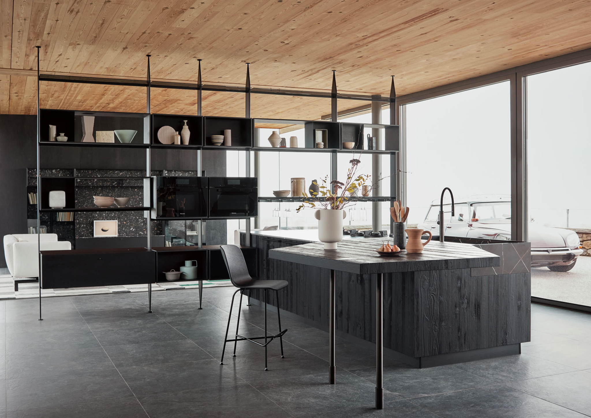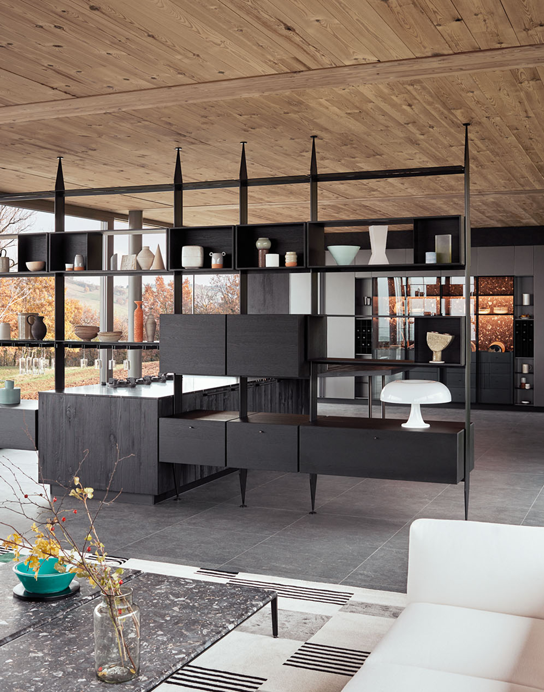 La búsqueda de integración se traslada al corazón de la casa a través de la isla Maxima en Tabià Nero y del sistema bifacial The 50’s, que actúa como un elemento arquitectónico ligero, capaz de separar cocina y salón sin interrumpir la continuidad visual. Esta solución permite organizar los espacios manteniendo una lectura abierta y fluida entre ambientes.