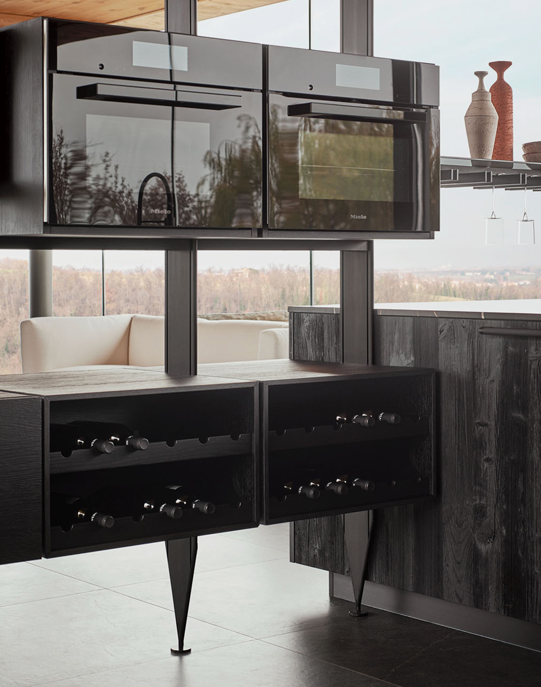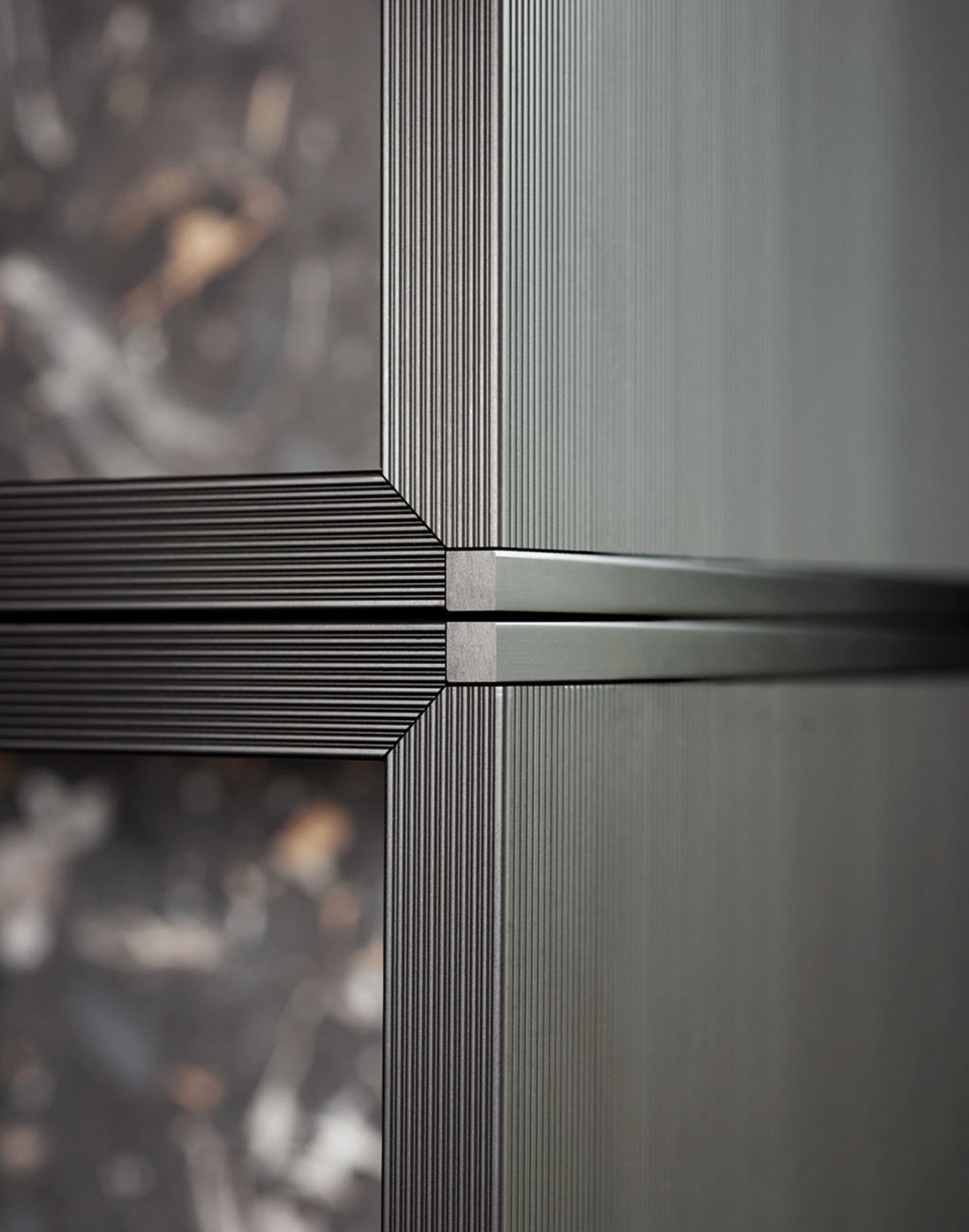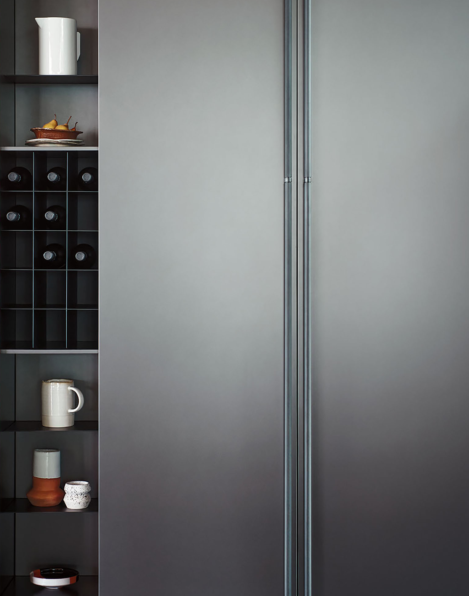 El sistema The 50’s funciona como una estructura bifacial abierta a dos ambientes, diseñada para acoger elementos de uso cotidiano sin interrumpir la percepción del espacio. Frente a él, las columnas lacadas con efecto metálico Ferro Anodyc enmarcan puertas de cristal que reflejan la luz exterior y amplifican la sensación de amplitud.
