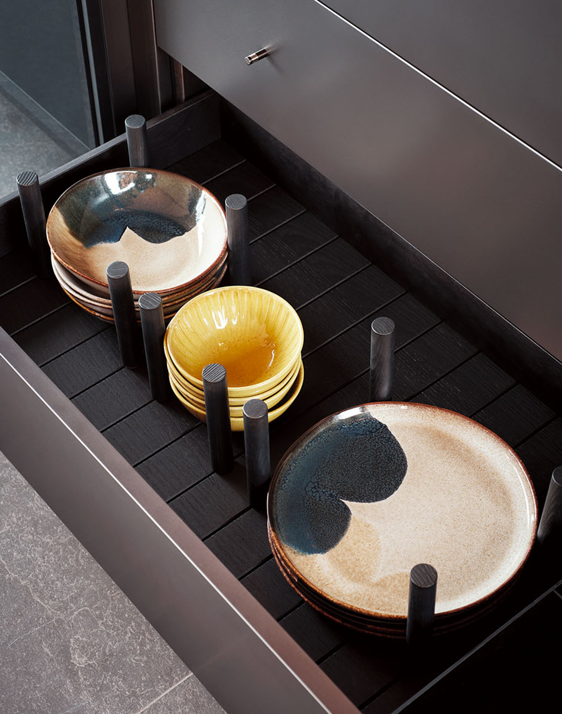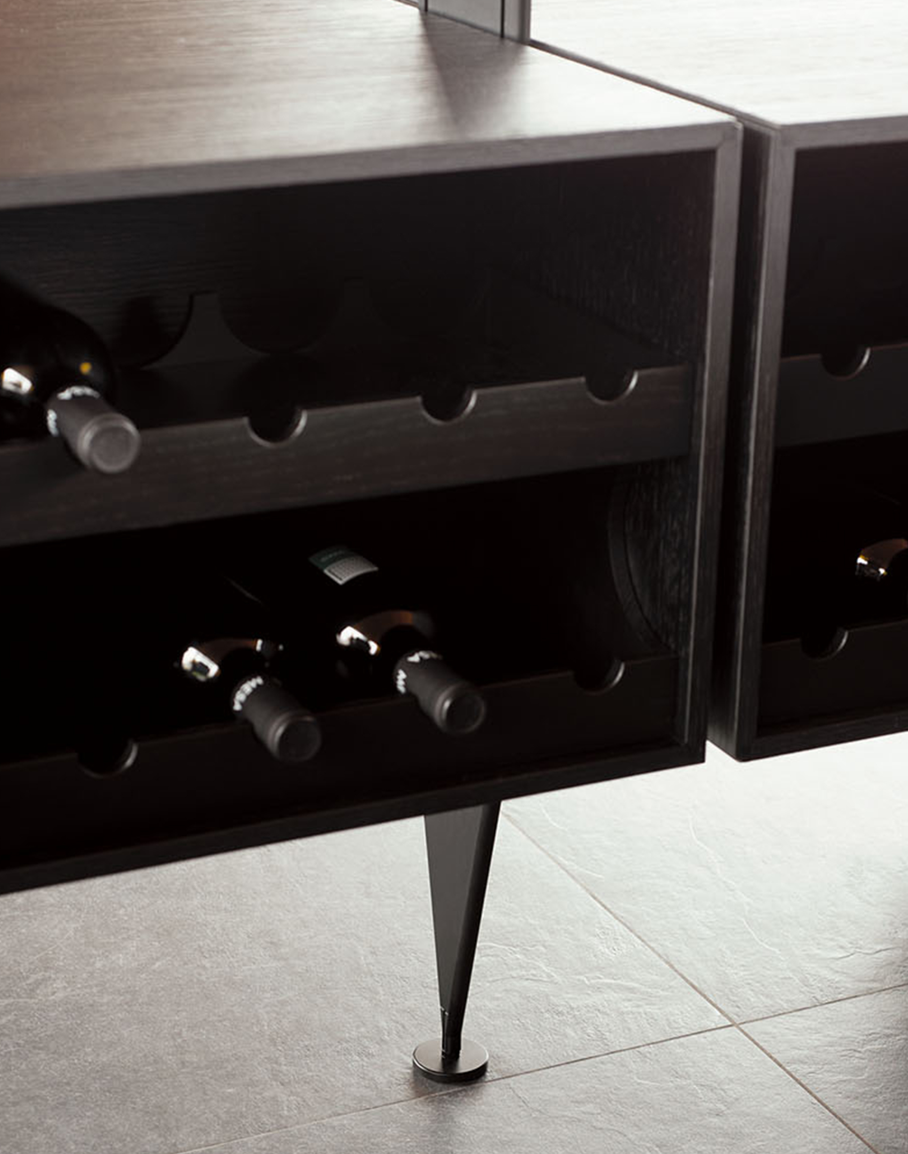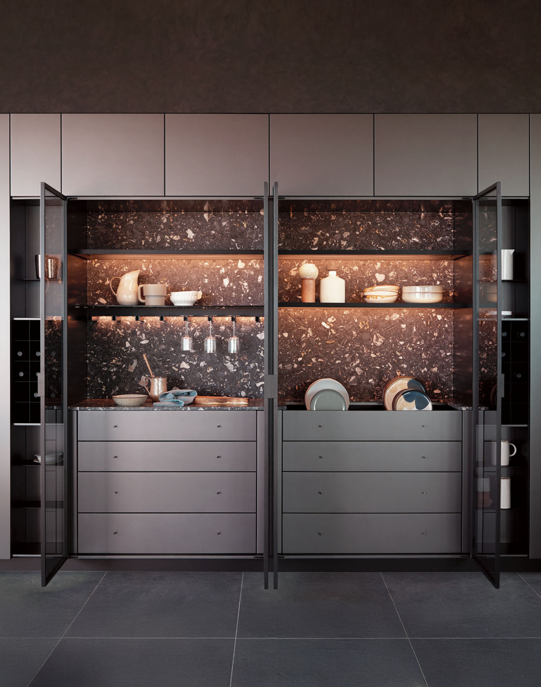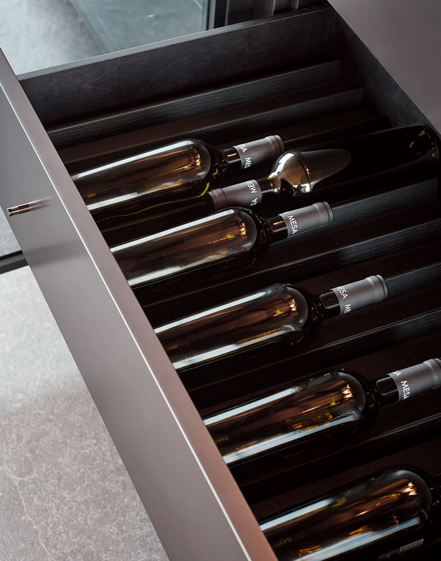 El sistema The 50’s funciona como una estructura bifacial abierta a dos ambientes, diseñada para acoger elementos de uso cotidiano sin interrumpir la percepción del espacio. Frente a él, las columnas lacadas con efecto metálico Ferro Anodyc enmarcan puertas de cristal que reflejan la luz exterior y amplifican la sensación de amplitud.