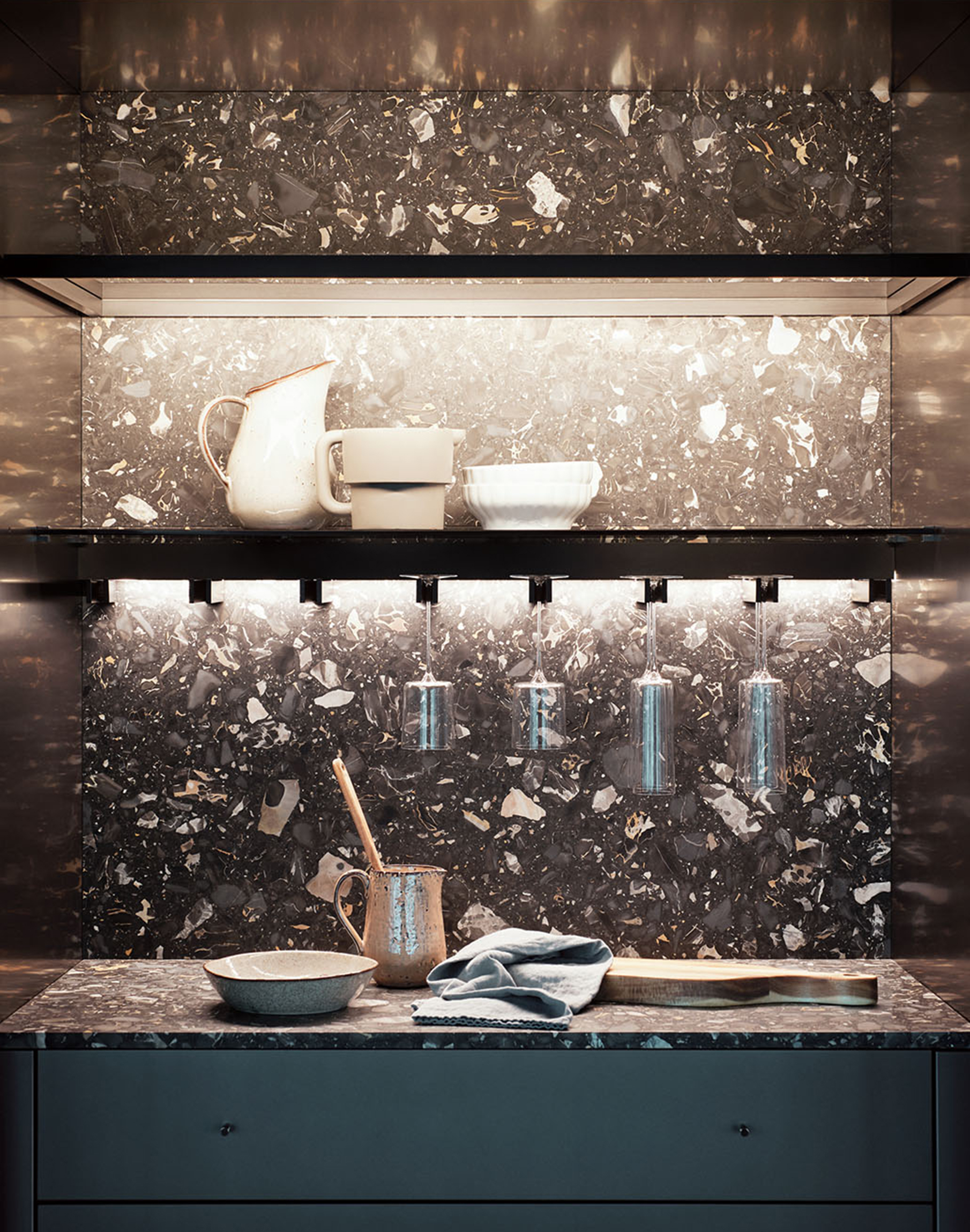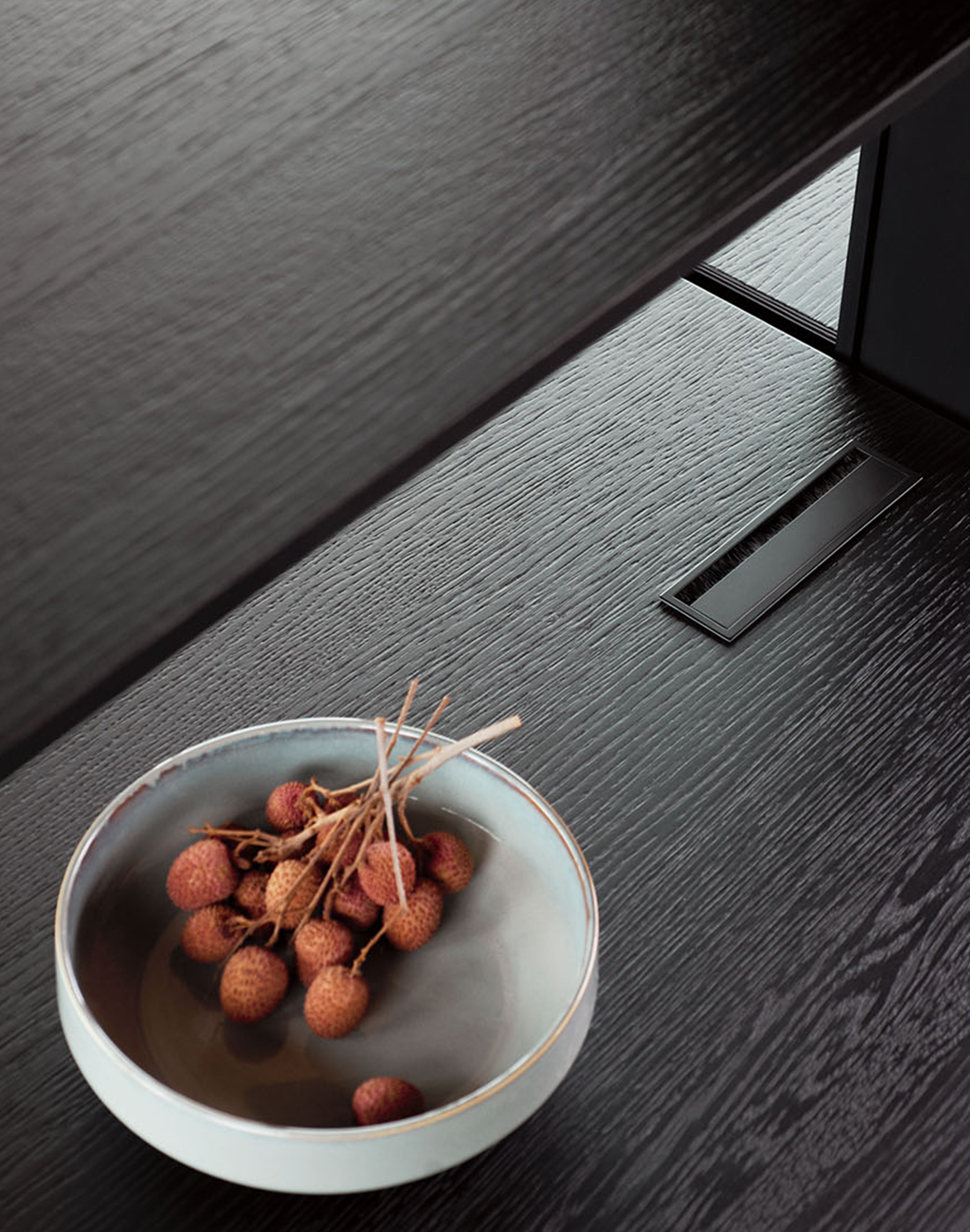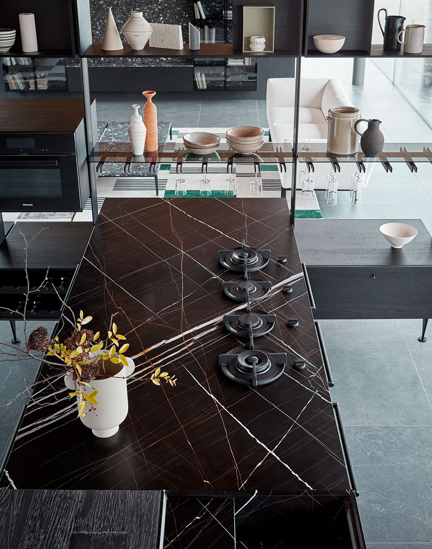 La coherencia de acabados continúa en los muebles bajos y en el panel de la wall solution Dressup, realizados en conglomerado Nero Portoro, un acabado de alto contraste cromático que también se traslada al Dressup del salón, utilizado como librería y nexo entre estancias.