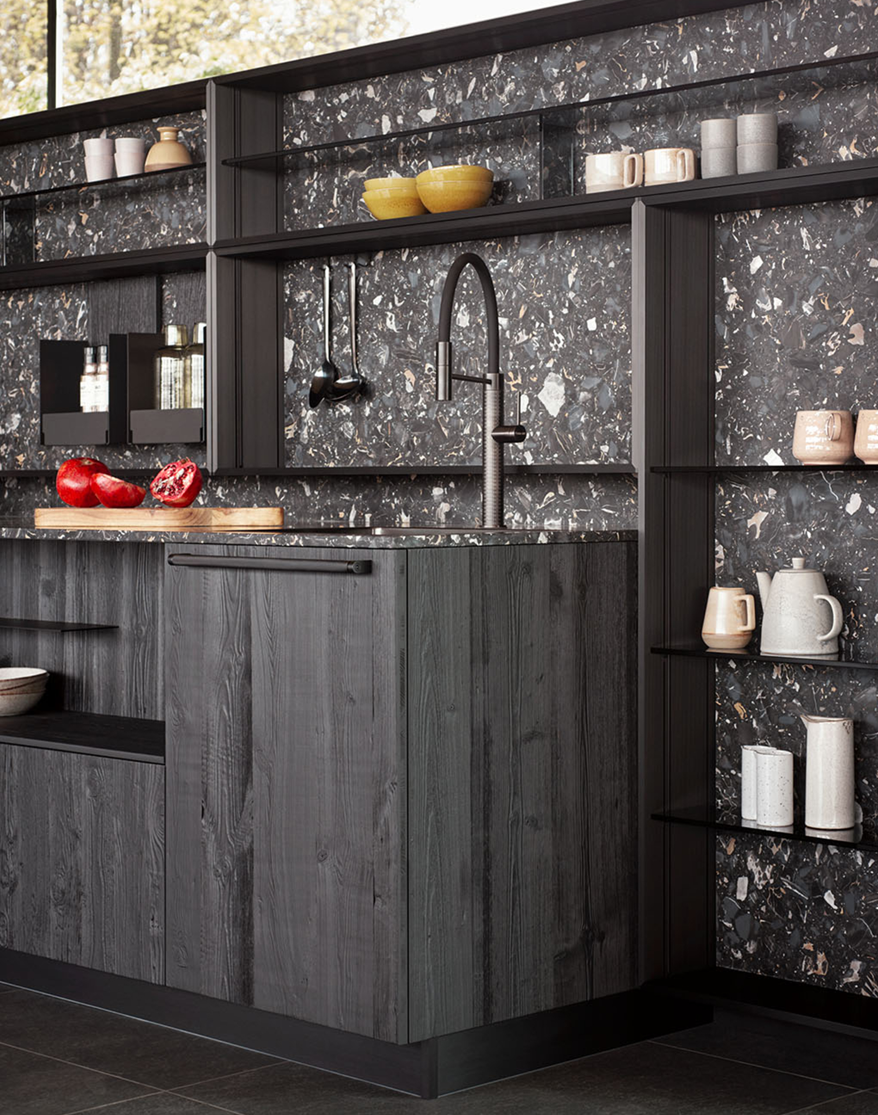 El carácter matérico de la isla se refuerza con la encimera de mármol Sahara Noir, de origen tunecino, cuyo fondo negro se ve atravesado por vetas blancas y doradas en composiciones casi geométricas. El contraste potencia el diálogo con la madera envejecida, aportando profundidad visual y equilibrio al conjunto.