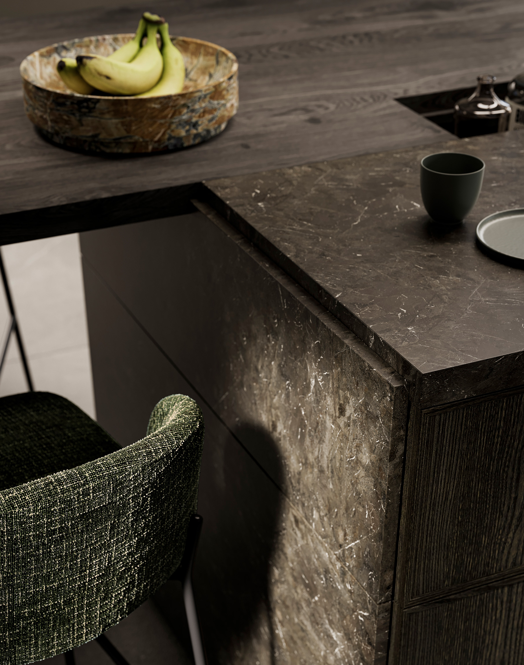 La versión en madera se distingue por su furnierado continuo, que asegura una línea uniforme en el veteado a lo largo de toda la cocina. Entre las opciones disponibles destacan la nordeiche clara, la cálida structura abruzzen y la sofisticada bergamo ulme, con matices oscuros que aportan profundidad al diseño.